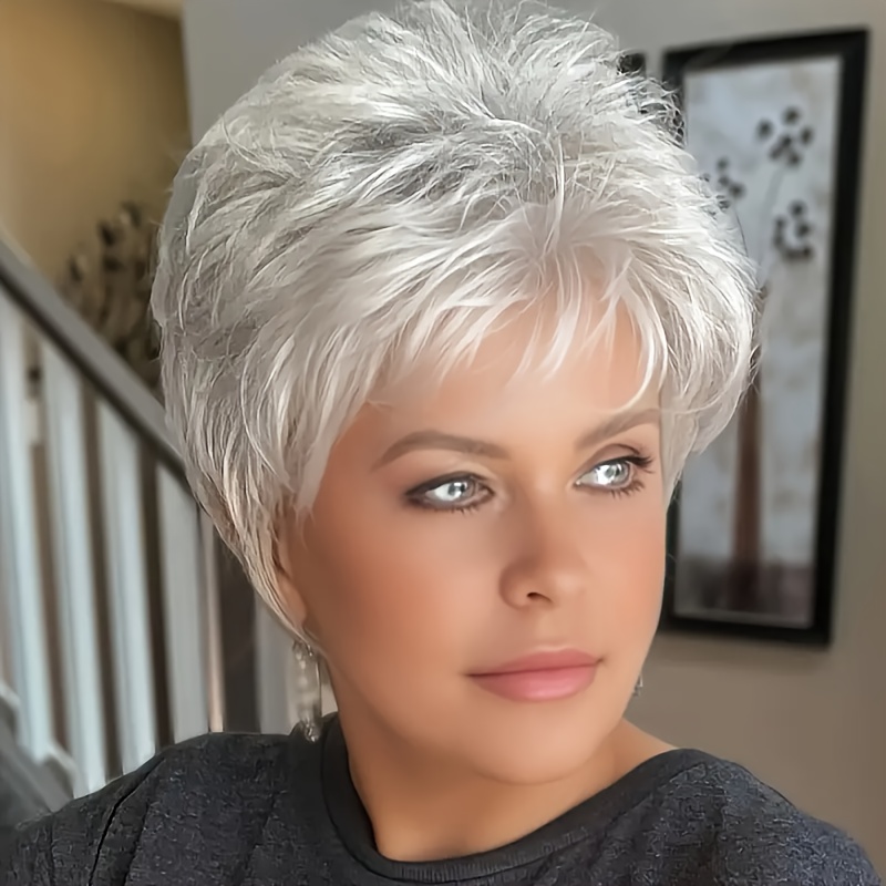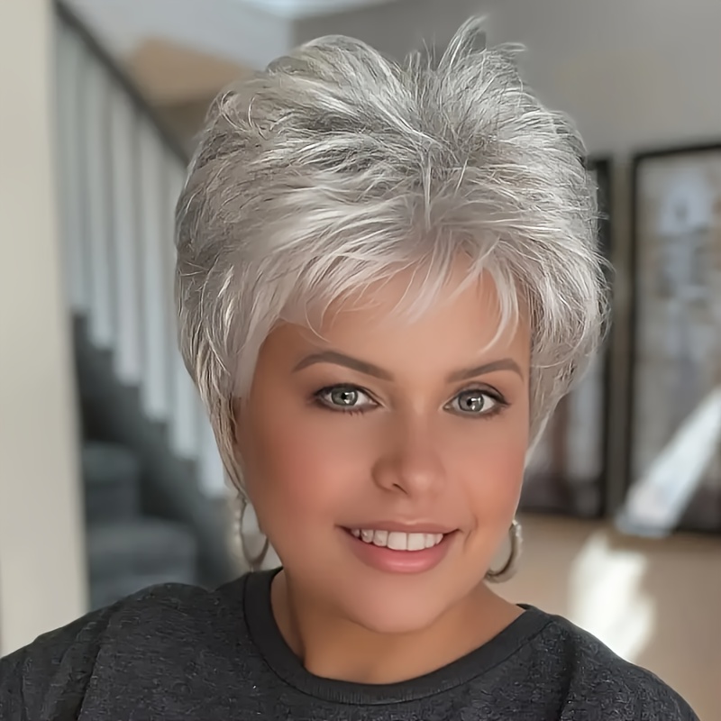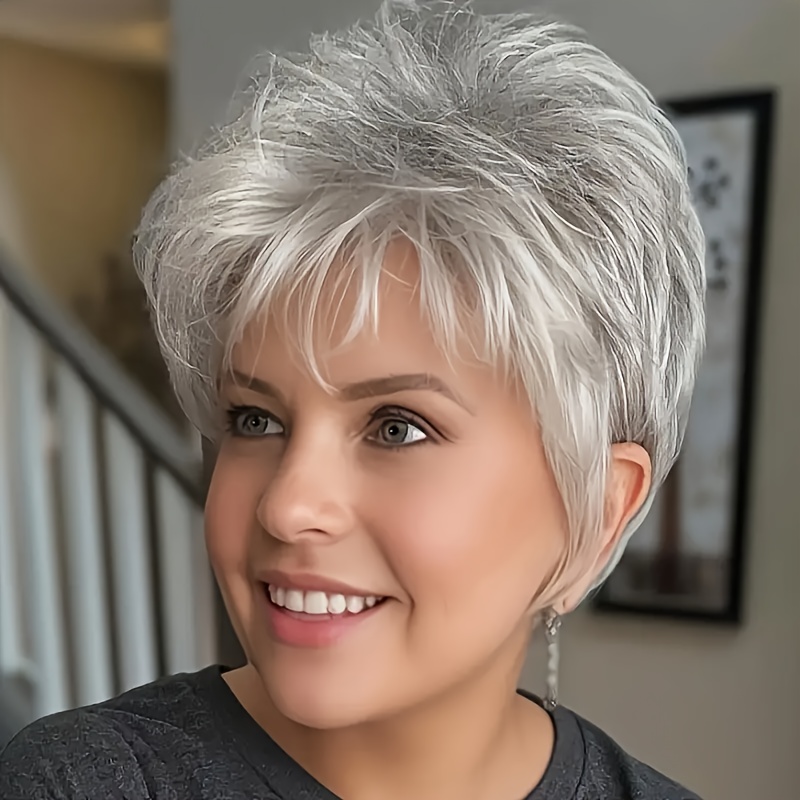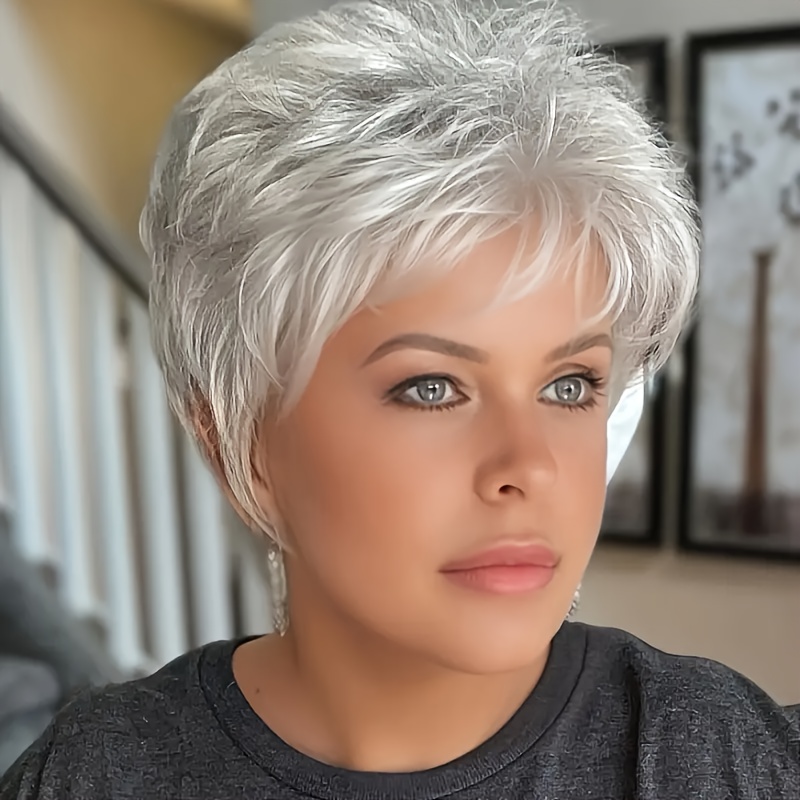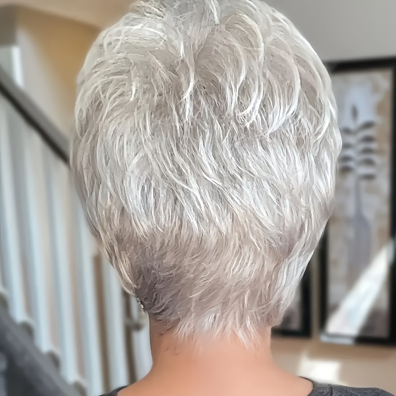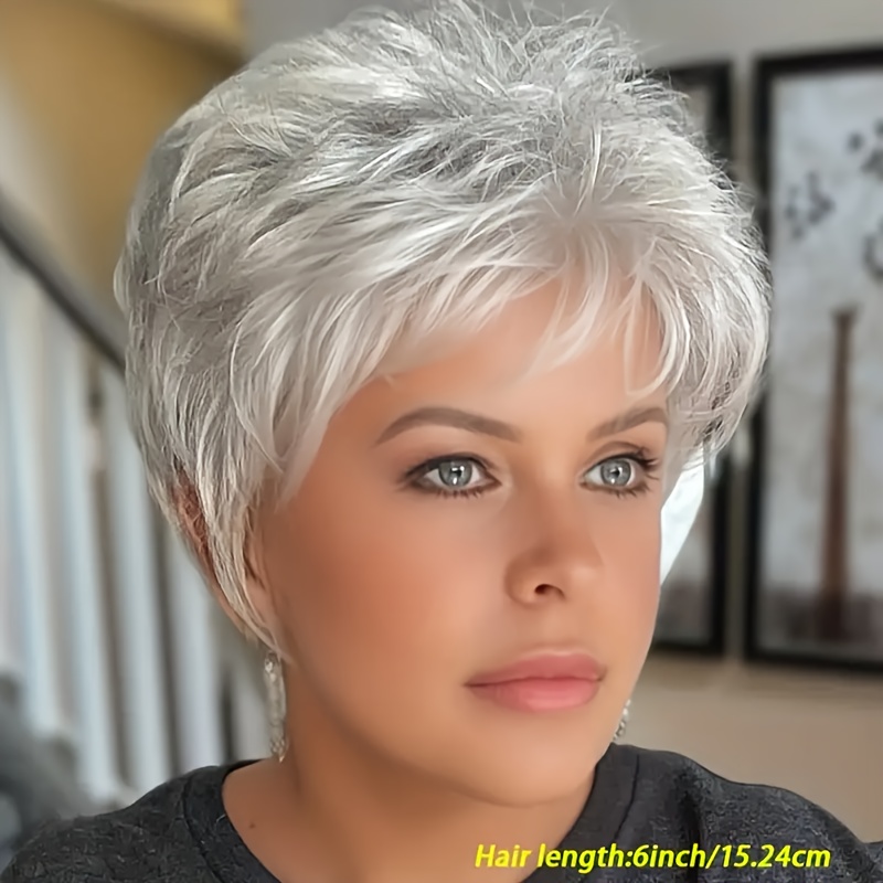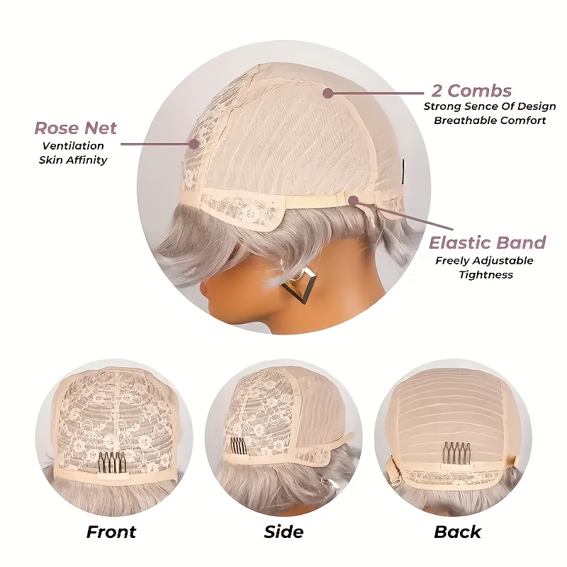 Women\'s Brazilian Hair Wig- Short Pixie Style, 6.0 Inch Long, with 150% Density And Straight Texture, Featuring a Natural Grey Appearance And Rose Net Cap, Perfect for Everyday Use And Special Events, Sleek Short Hairpiece with a Secure Fit.